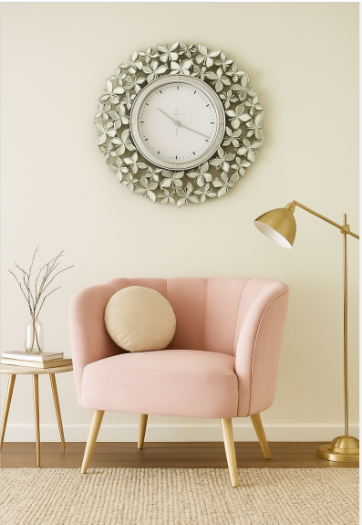 Expertly crafted, this stunning timepiece features a beautifully sculpted mirrored floral frame, delicately arranged to create a dazzling three-dimensional effect. Each petal captures and reflects light, adding a soft shimmer that brightens any room. The round clock face, framed in polished silver, contrasts elegantly with its sleek black dial and minimalist white hour markers, ensuring easy readability while maintaining a refined aesthetic.