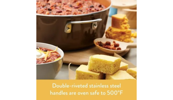 Double-riveted stainless steel handles for a sure and comfortable grip. Shatter-resistant glass lids to observe foods as they cook while sealing in heat and moisture.
