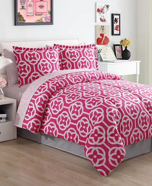Add a romantic touch to your bedroom with the Chelsea comforter set from Macy’s featuring a geometric print that reverses to solid.