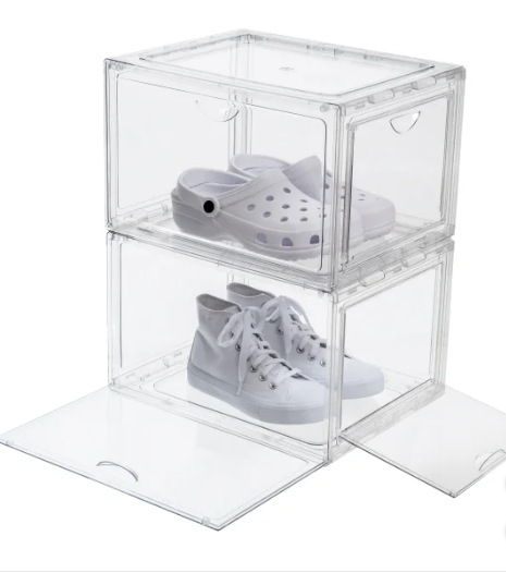 This 4-Pack Clear Stackable Shoe Box Storage Organizer by HUIZHOU STANDBY HOUSEHOLD is the ultimate blend of durability, style, and practicality for shoe lovers and organizers alike.
