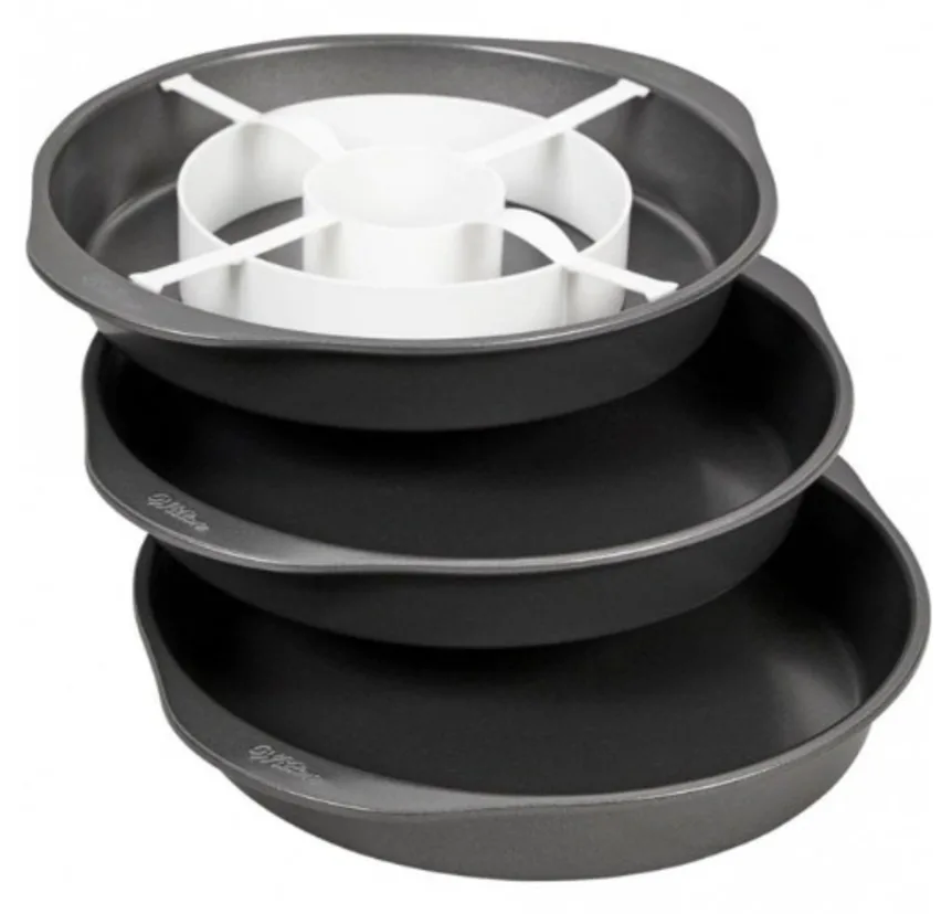 This unique baking pan set, will make every piece of cake look like a multi-coloured piece of art. It‘s simple and it works. The separator ring divides the cake batter into different sections of the baking pan easily. Using all 3 pans you could create 3 layers.